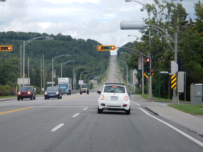 Maar zit je op een snelweg, dan is die ook groot. Bij Toronto heb je de Express, die heeft 3 of 4 banen, en de collector ernaast, die ook zoveel heeft. Dus 6 tot 8 banen dezelfde kant op. En soms tijdelijk met een baan extra. De meeste afritten op de collector, de Express gaat, nou ja, het snelst. Beide gaan 100 en zijn slaapverwekkend saai. Dus eigenlijk een 8-baans weg. Door de stad heb je ook 2 en 3-baans wegen. En natuurlijk de éénbaans in vele soorten.